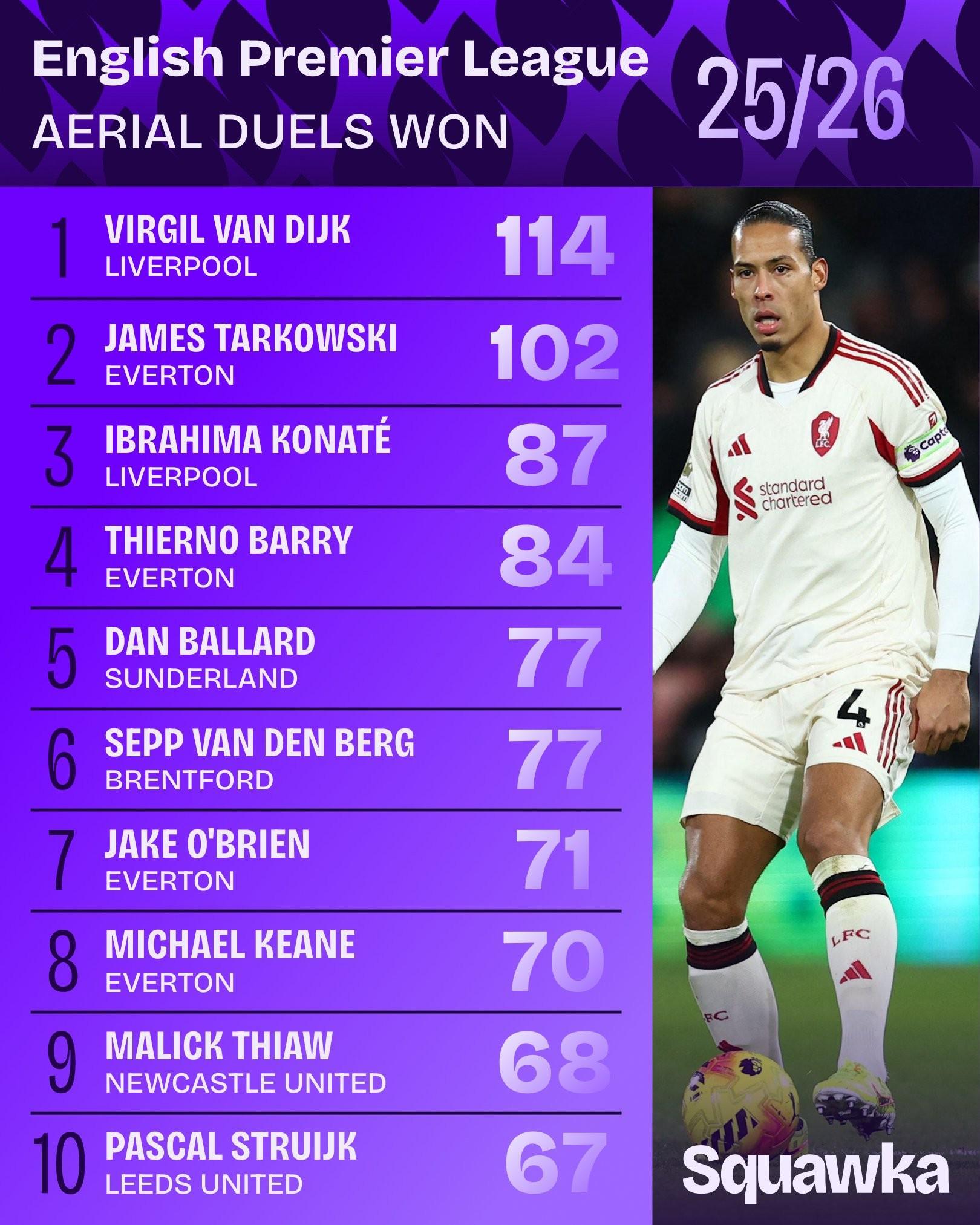 据统计,范戴克在前23轮英超赢得114次空中对抗,成功率高达76.5%,均排名第一。